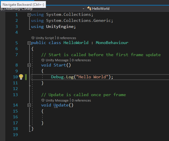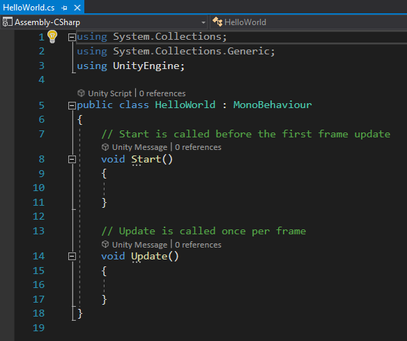 Every time you create a new script, Unity gets you started with a default script that contains the basic lines of code you will need. In this tutorial, we’ll give you a tour of the default script, write some code to use the functions provided, and link you to some resources where you can learn more.