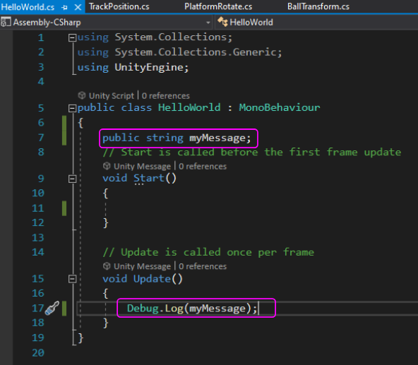 public string myMessage; 3. Change the Debug.Log command as follows:
