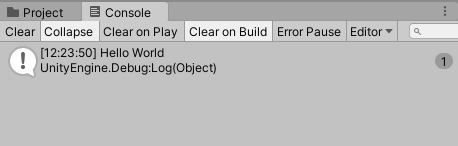 4. Play the game and look at the Console window. The message “Hello World” appears there.