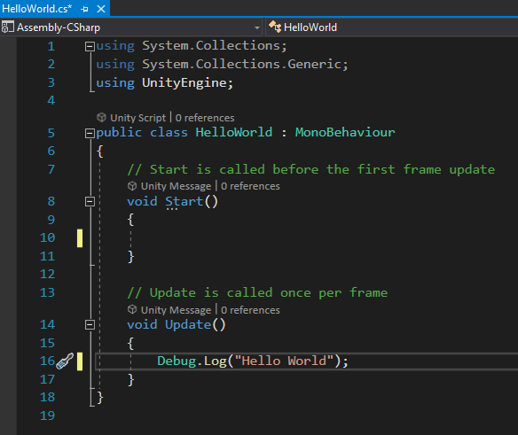 In the code, you will see a public class already set up. It is called “HelloWorld”, the same as the name of the script. These names should always be the same — if you change the name of the script, you must also change the name of this class.