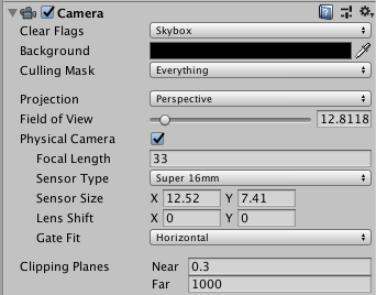 In addition to Field of View, the Physical Camera’s coverage can be specified by two related settings: Sensor Size, matching the sensor size of a real or imaginary camera, as well as Focal Length. The Sensor Size is the physical size of the area onto which the image is rendered (or “filmed”), and the Focal Length is the distance between the lens and the film/sensor.