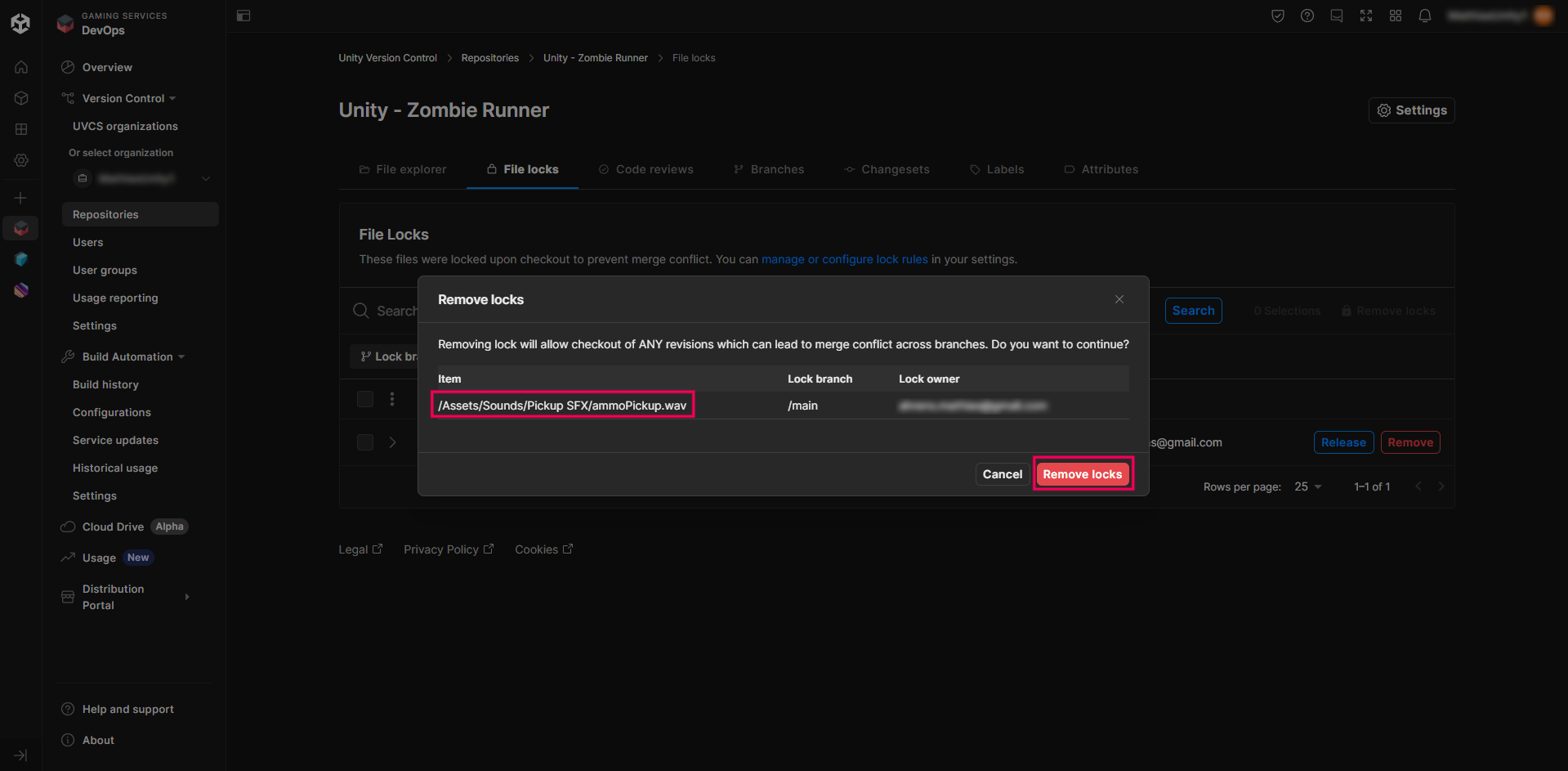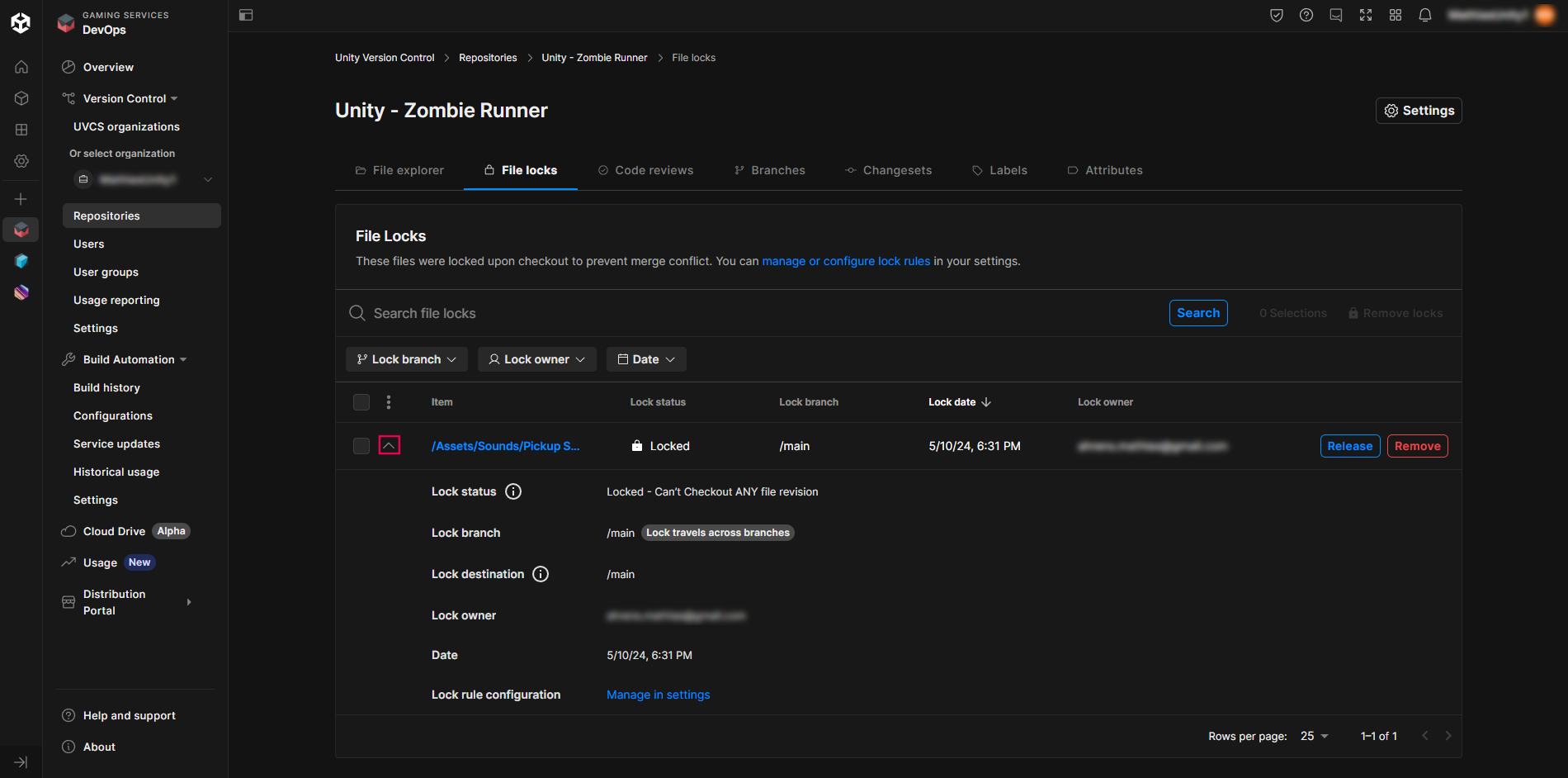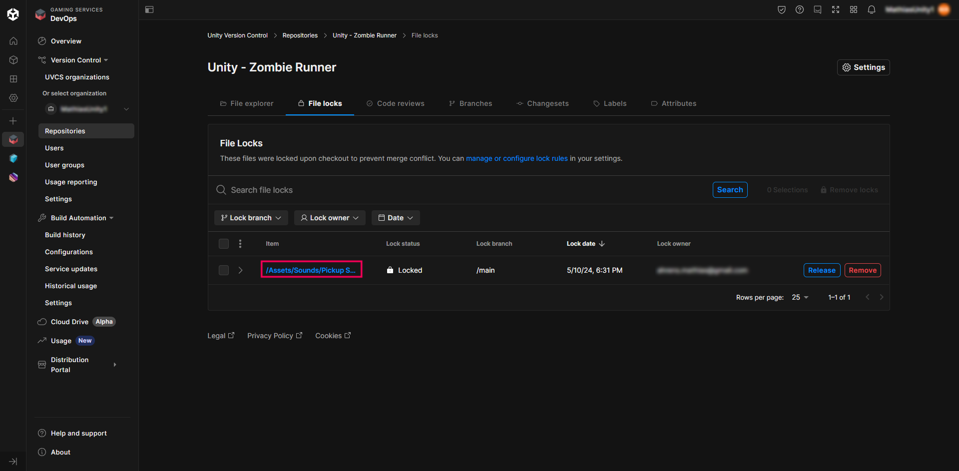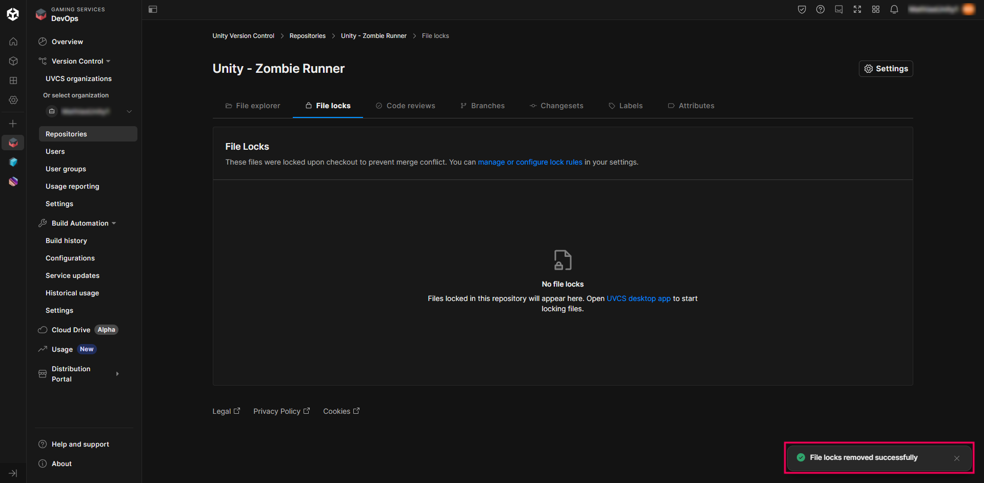 8. Go to the Unity Cloud Dashboard and check if the locked file appears in the list.