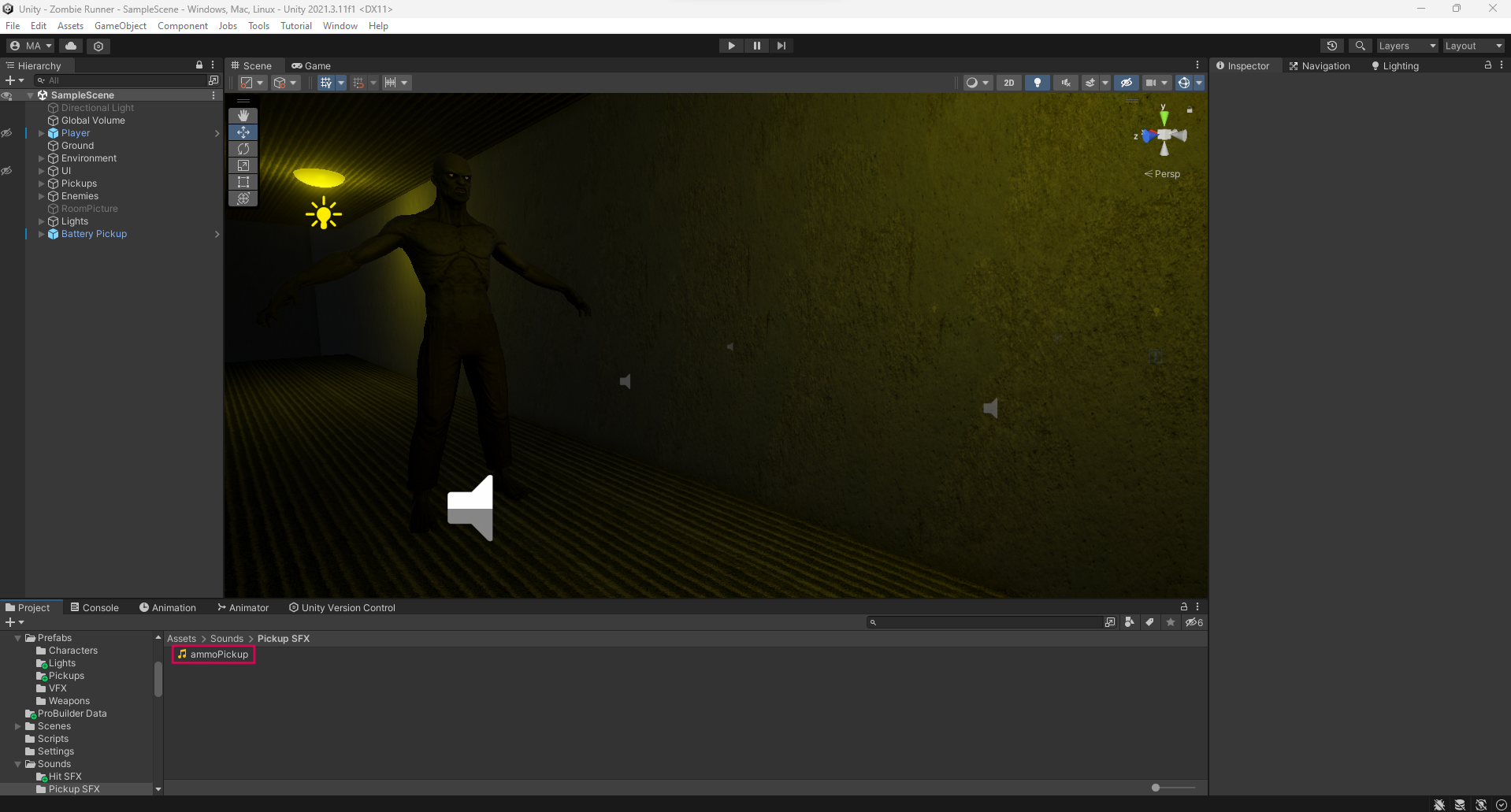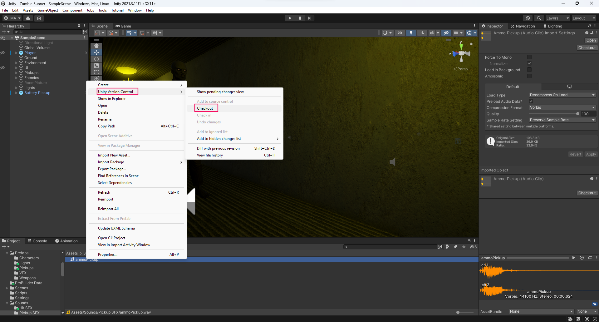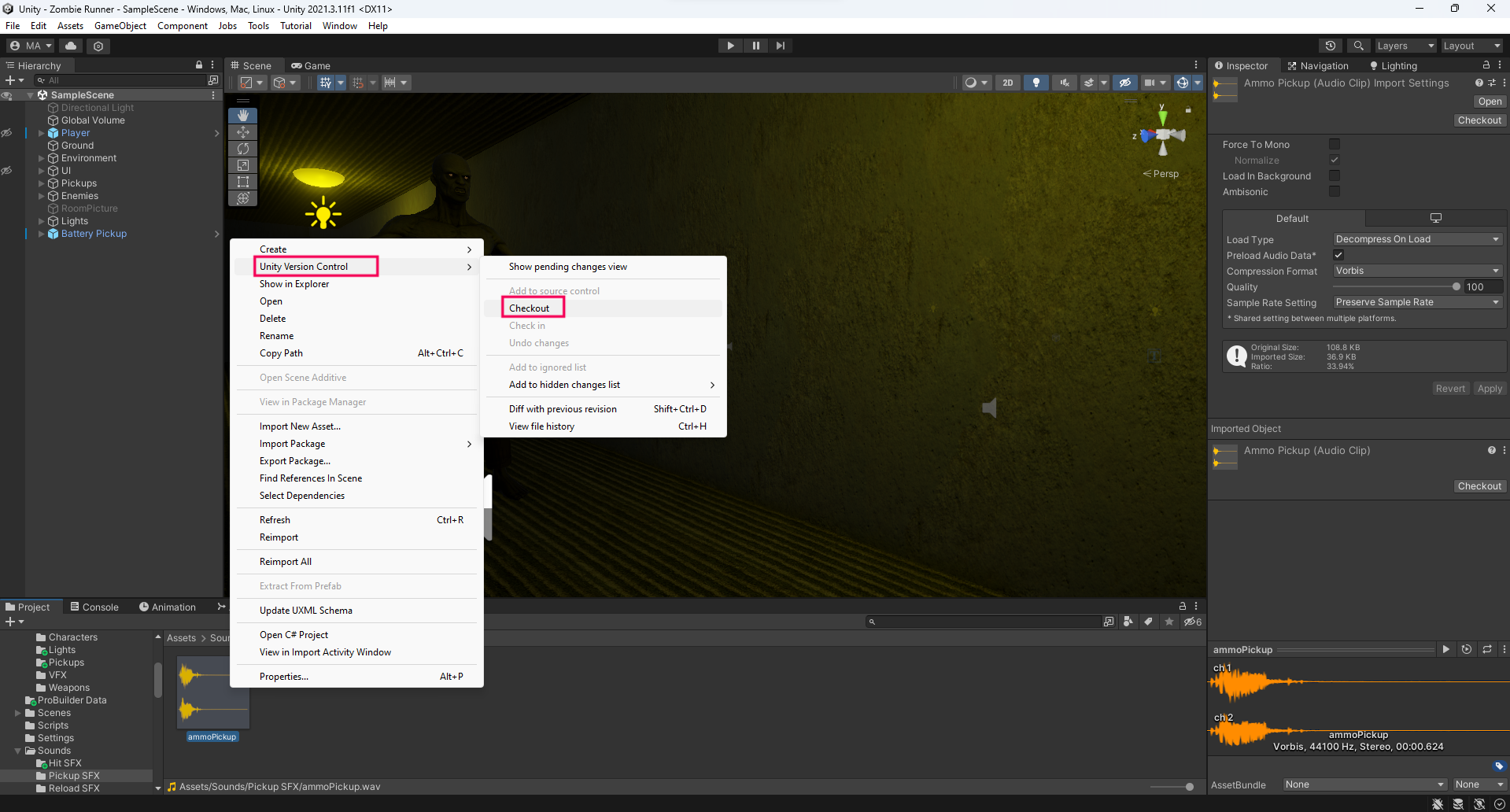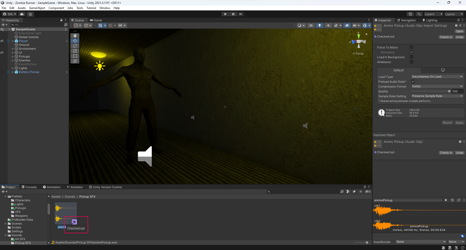 The following example applies to any file type that you listed in the lock file extension field. Imagine that you want to start editing this ammo pickup sound for a zombie survival game. Because it is a .wav file, it falls under the file extension rule that you created in the previous step.