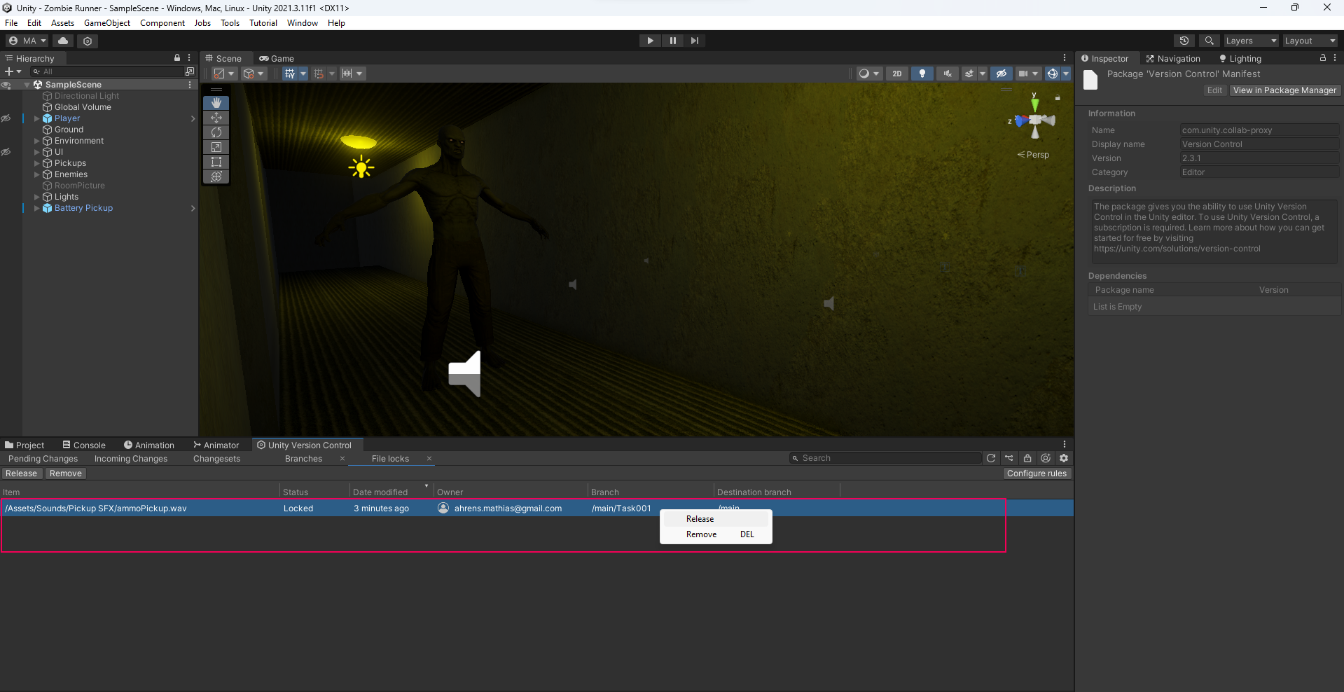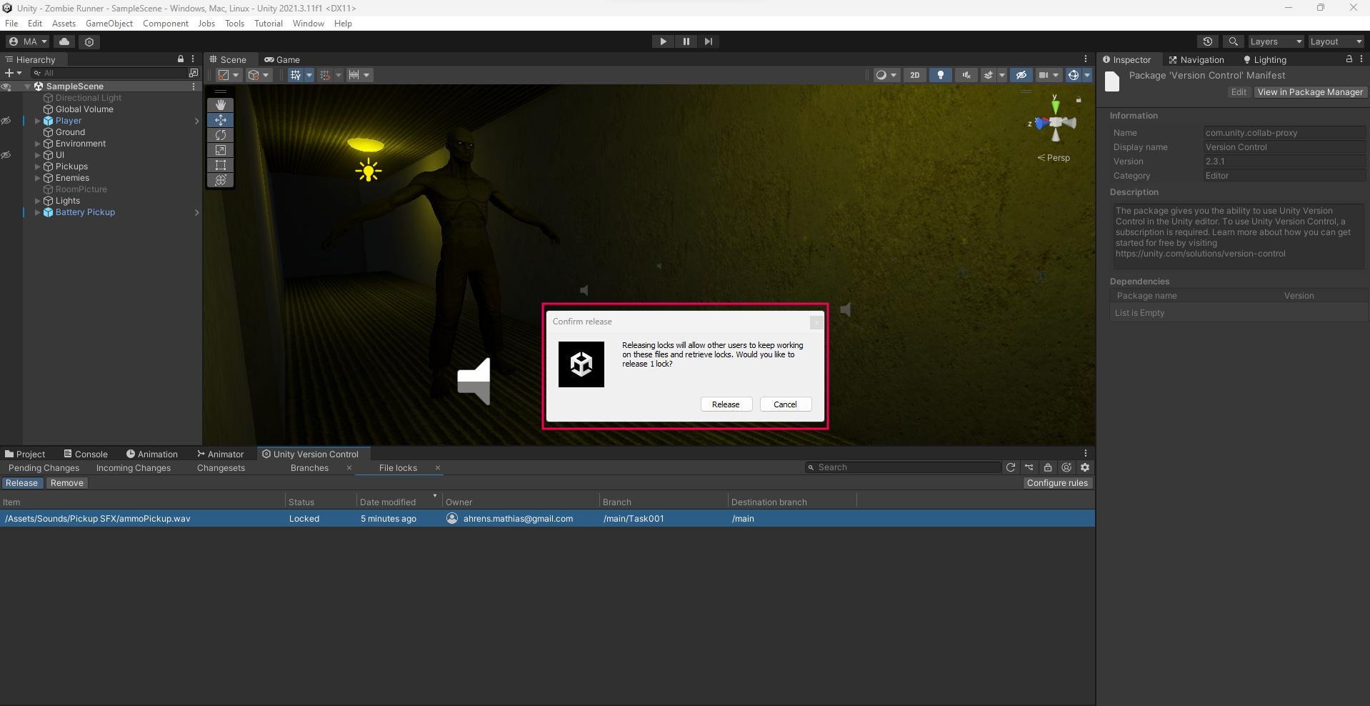 This time, the warning message informs you that this operation can result in a future merge conflict. This is because if you remove the lock of that .wav sound file, others will be able to edit it on their side, and you will end up with 2 different versions of the sound file: one with your changes and another with your team member’s changes. This is called a merge conflict, because the project doesn’t know which version it should keep in your game. This is especially risky when team members are working on different branches.