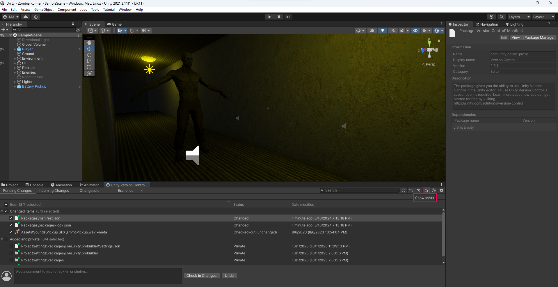 You can also see your locked files directly from the Unity Editor in the latest versions of the Unity Version Control package by selecting the Show locks icon on the right side of your Unity Version Control plugin: