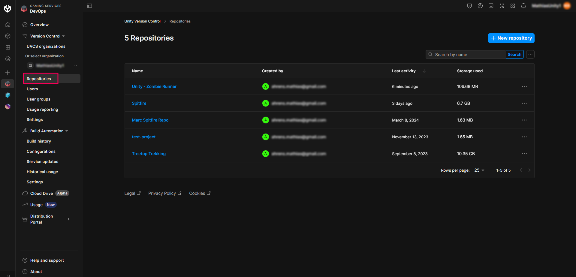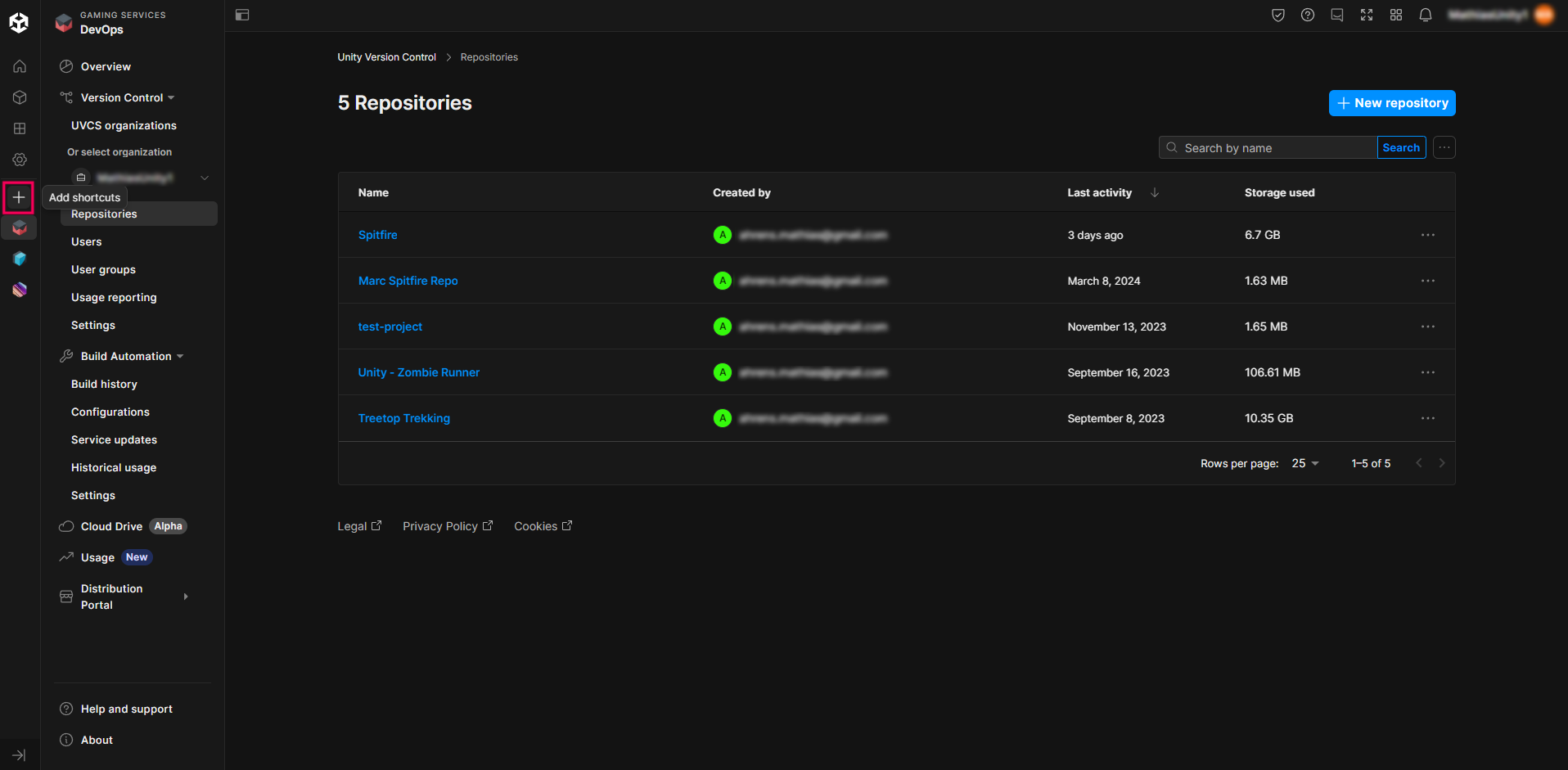 1. In the Unity Cloud Dashboard, select the Repositories button.