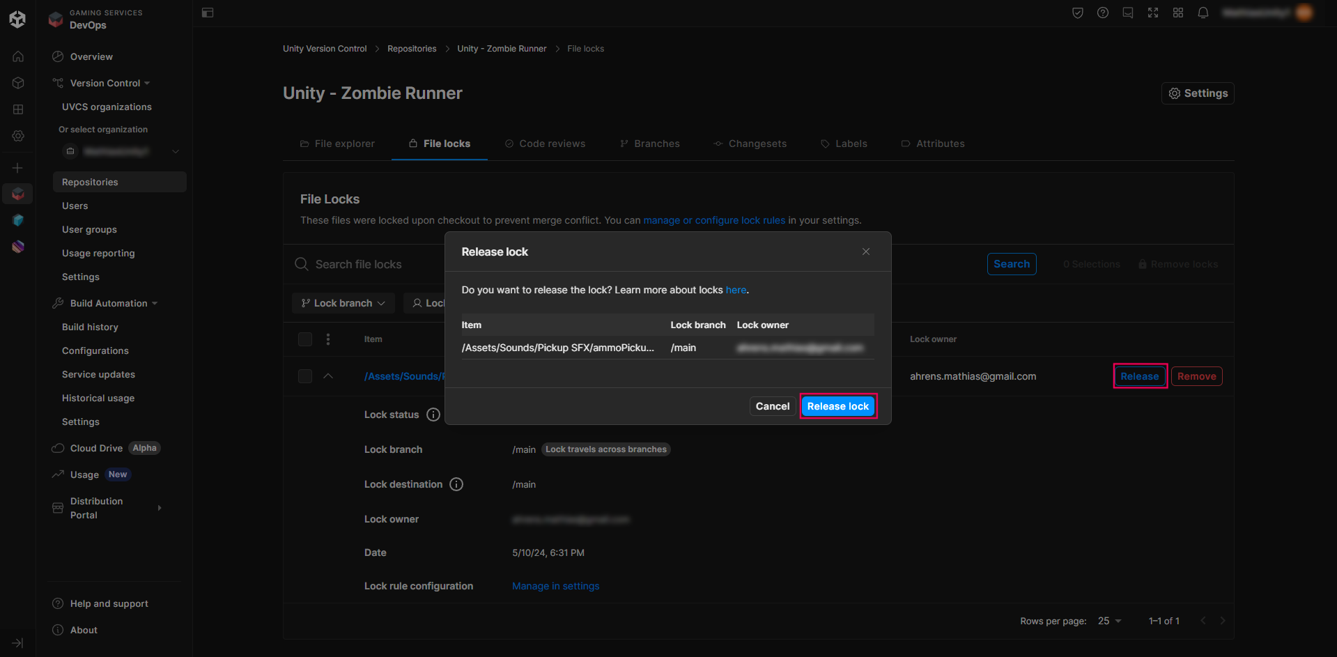From here you’ll be able to see the current lock status of the file, its current branch location and destination, who locked the file (with the email address of the user), and the date when it was locked.