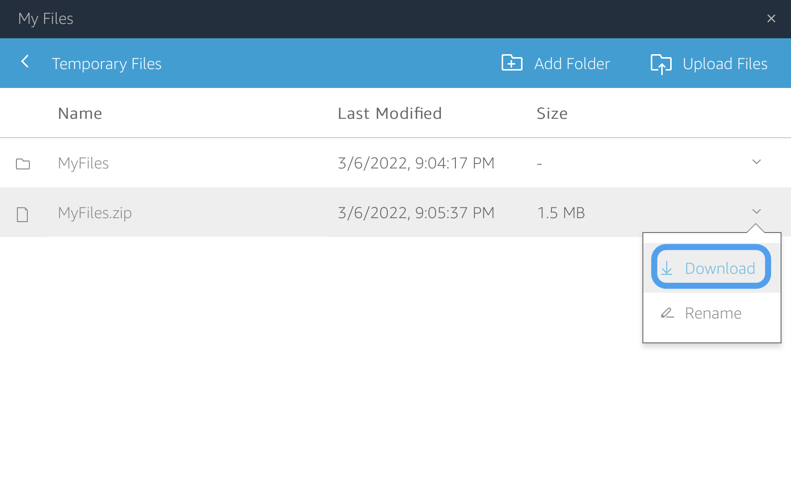 Inside you will see your zipped folder. Click the drop-down arrow on the right side, then click ‘Download’.