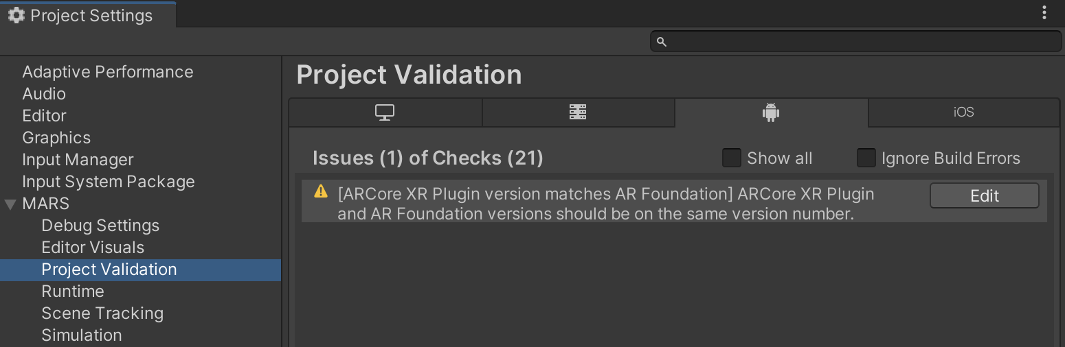 Unity Mars has a built-in Project Validation tool that you can use to avoid common configuration issues with your scenes and project. You can access this tool in your project settings (Edit > Project Settings > MARS > Project Validation).