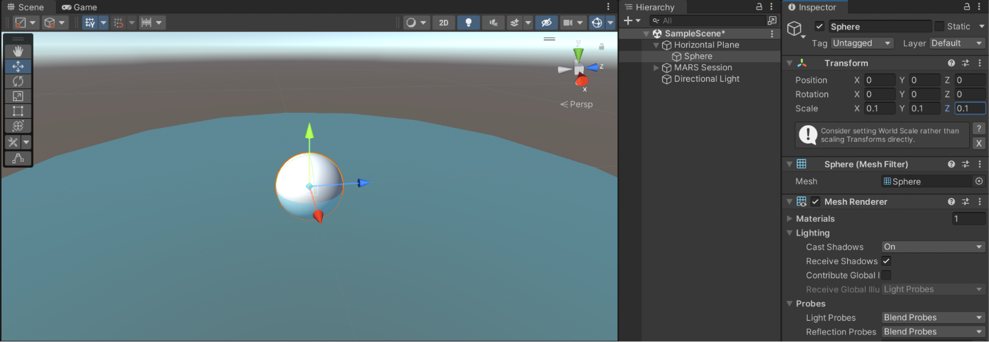 5. Select the Sphere GameObject. In the Inspector, adjust the Scale values to (0.1, 0.1, 0.1) to scale the sphere to about 10 cubic centimeters.