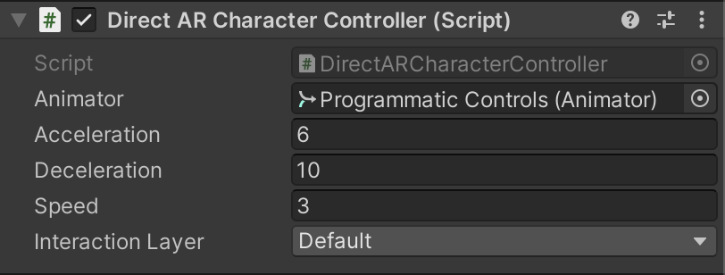 2. In the Inspector, find and review the Direct AR Character Controller (Script) component.