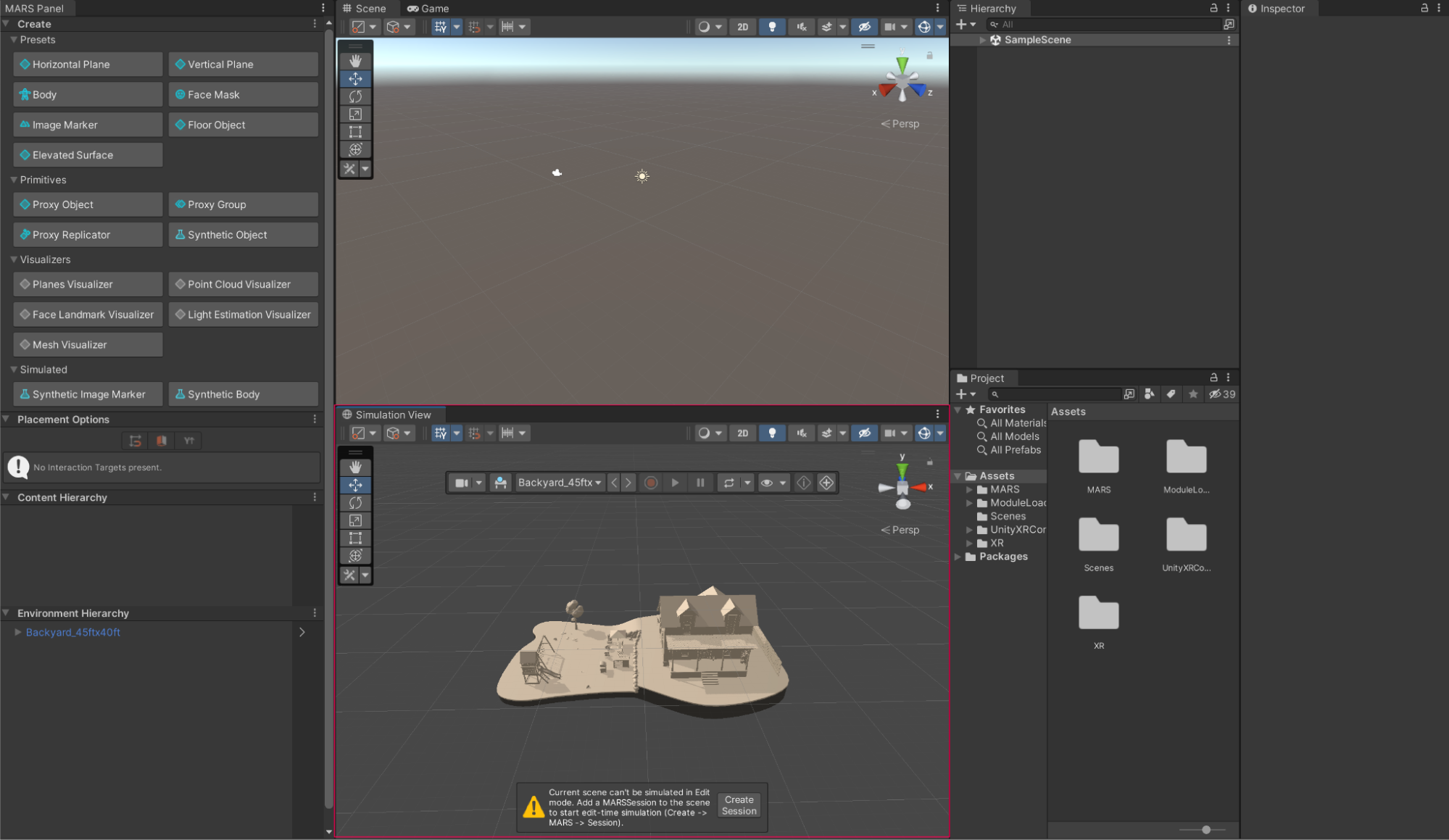 2. When the installation is complete, go to Windows > MARS > Simulation View. The first sample will display in the window when it opens: a house and backyard scene.