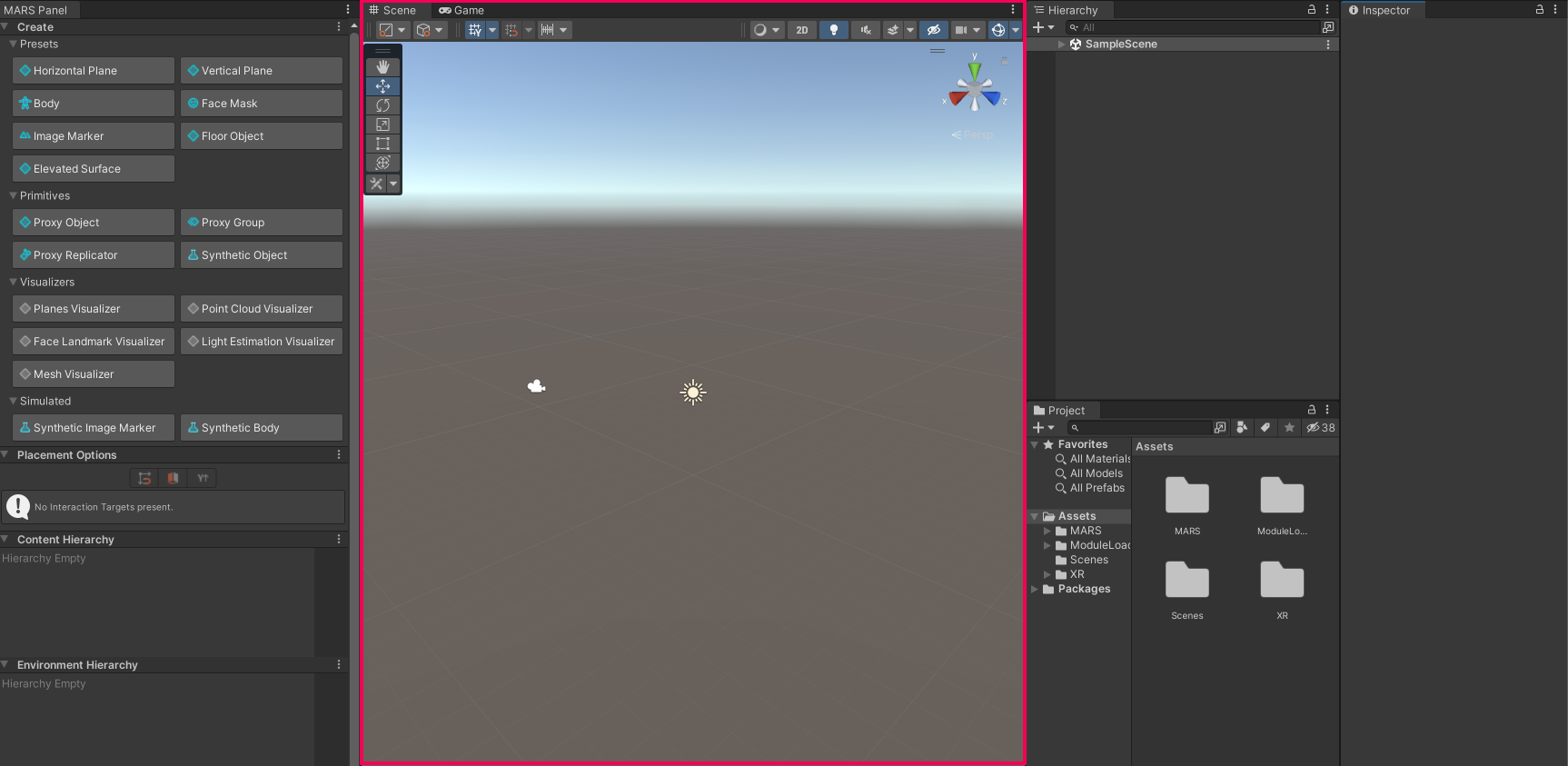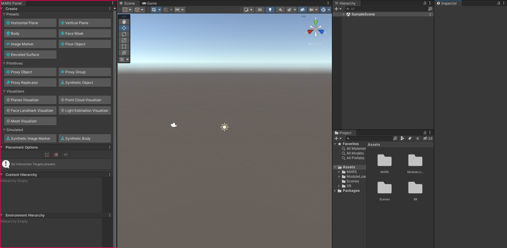 The MARS panel is the main entry point for accessing all Unity Mars functionality in the Unity Editor. You’ll use this panel to create AR objects, access shortcuts and presets, and review an overview of what is going on in your scene. Adjusting your Unity Editor layout can make it easier to establish a smooth workflow with the MARS panel and other Unity Mars windows.
