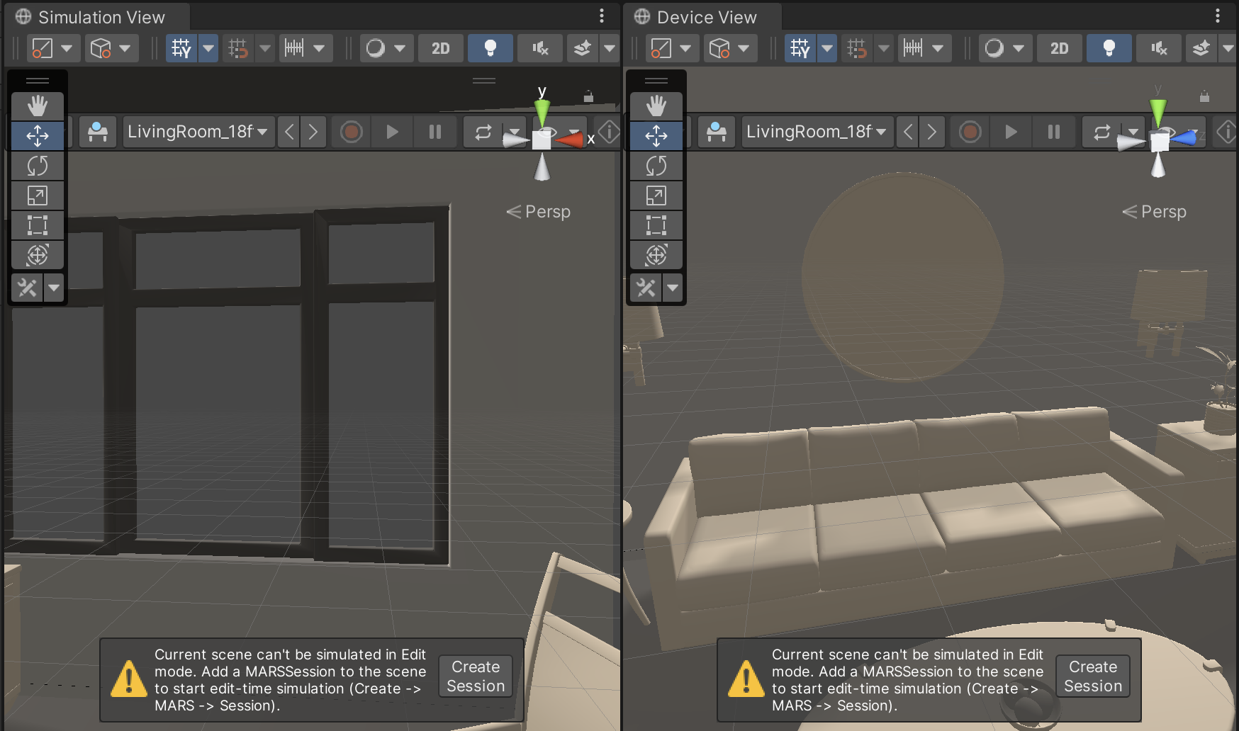 The Simulation view separates your AR content from the simulated environment, mimicking rendering and interaction behavior of real AR devices. You can interact with your AR content or with the simulated environment.