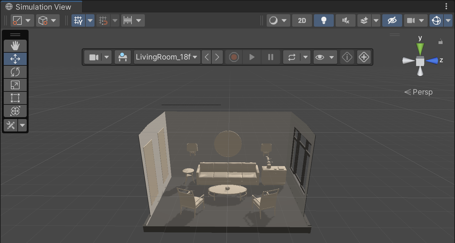 The Simulation view displays your AR app running in a simulated environment, showing the entire Scene that you are working in. You can use the Simulation view to test your app against a variety of data sources, including synthetic environments and pre-authored recorded streams. This functionality of the Simulation view reduces the need for you to build your app to a real-world device for testing while you iterate.