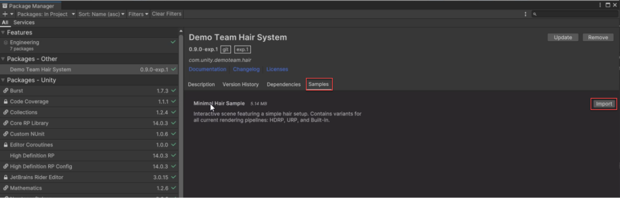 3. Locate the sample content in your Project directory at Assets\Samples\Demo Team Hair System\0.9.0-exp.1\Minimal Hair Sample.