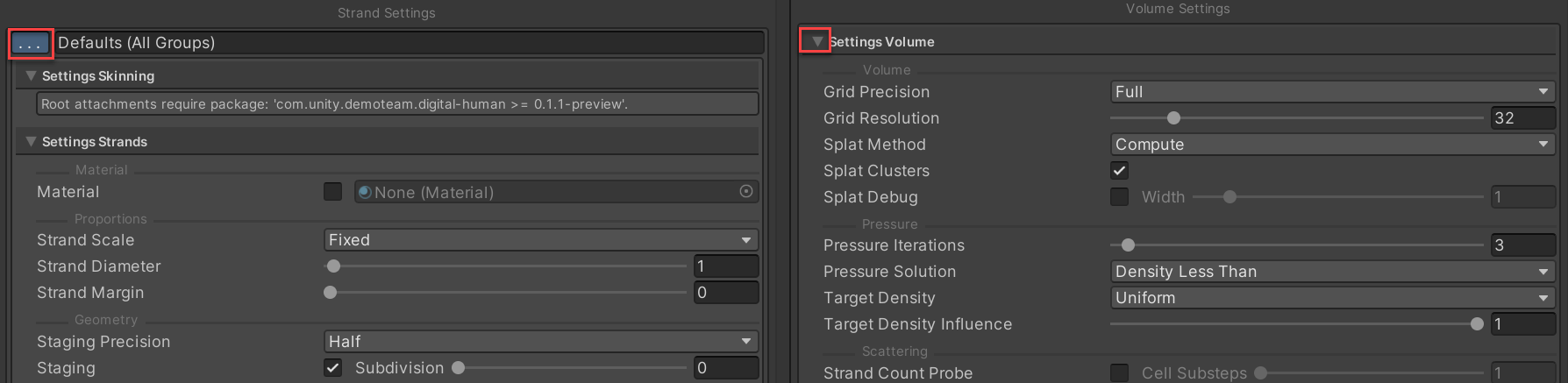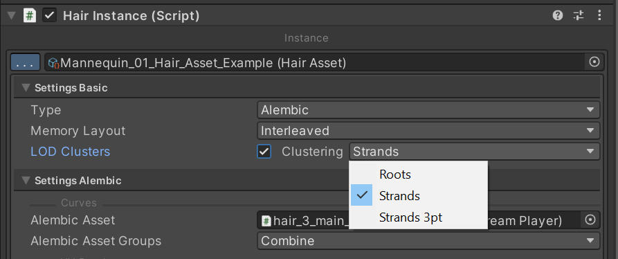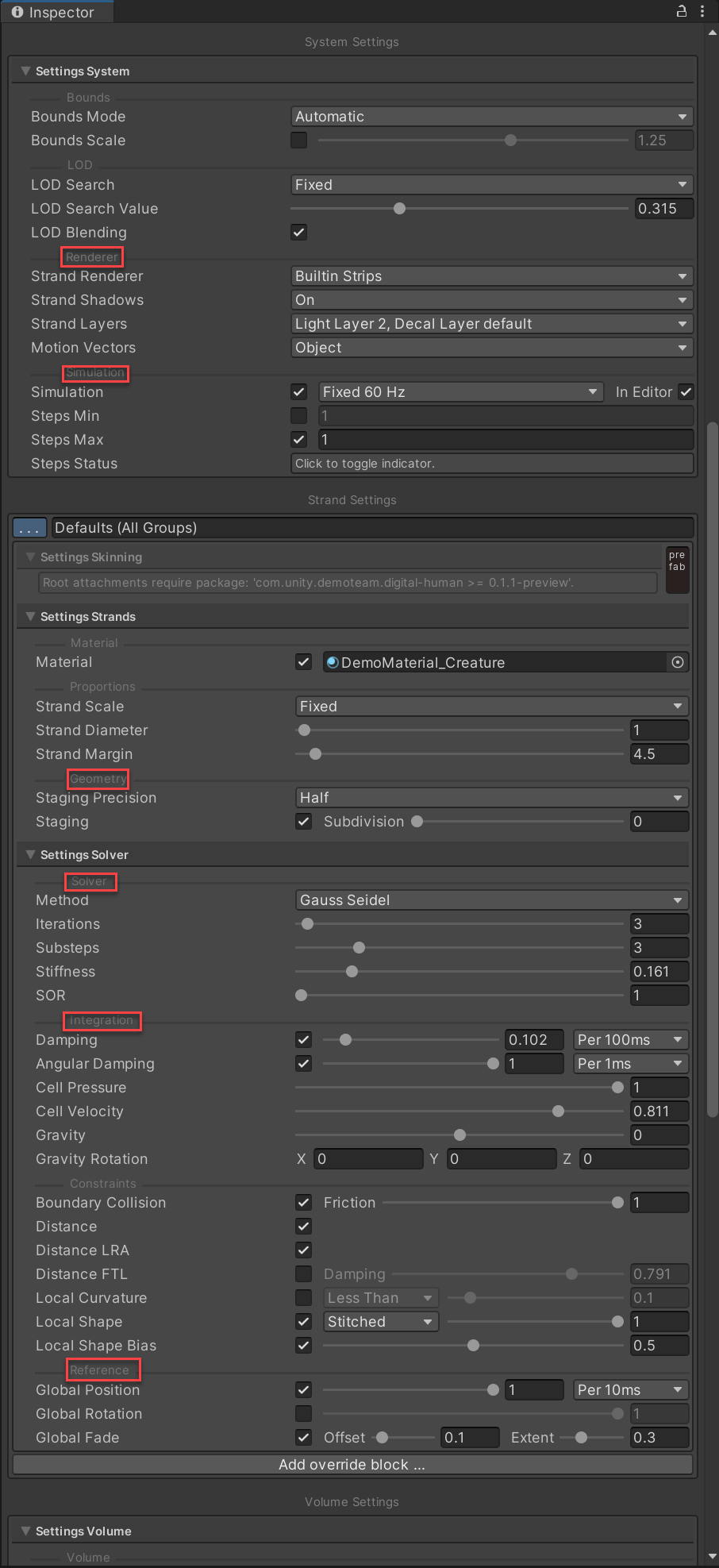 The hair instance controls the hair asset and its simulation parameters, such as system and strand settings (for example, configurable constraints or level of detail (LOD)) and the hair instance volume settings (including the hair instance volume debug settings). You can assign multiple hair assets to one instance, such as main groom, fly-aways, or baby hairs. This division of groom parts could be relevant for characters with human hair, for example.