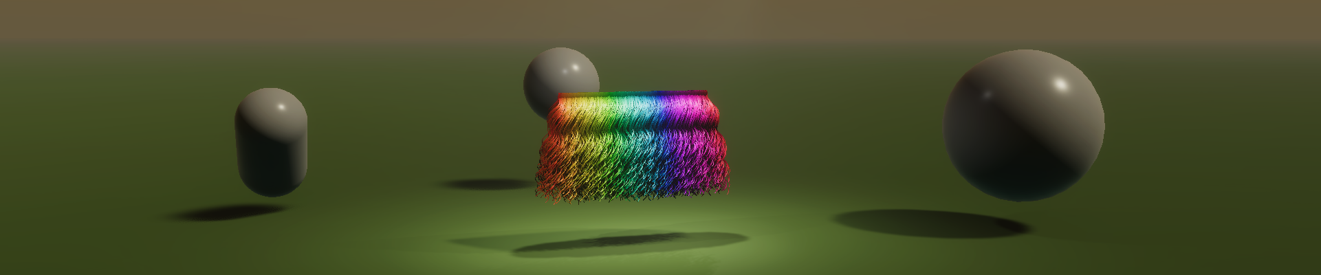 The sample scene provides you with a basic setup of a procedural groom (in the form of a debug-colored curtain) and some primitives for collision demonstration.