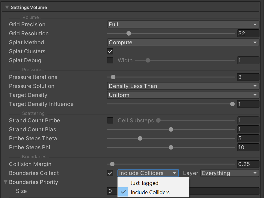 2. Enable Boundaries Collect in the Volume Settings and select the Include Colliders option to automatically recognize physics colliders (for example, spheres, cubes, capsules).