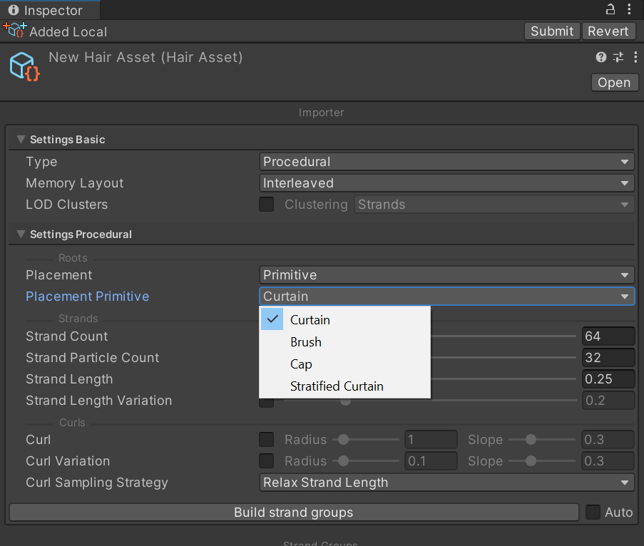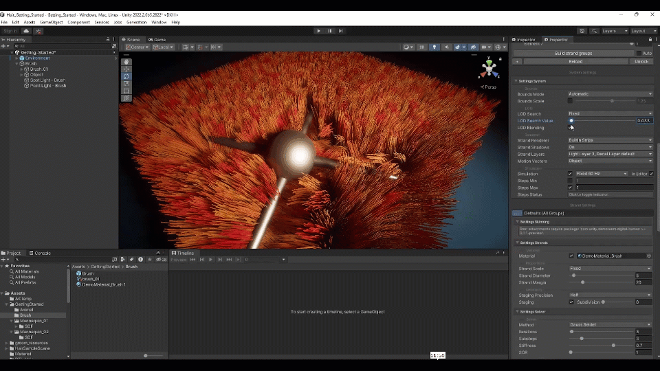 Feel free to explore the system by changing the hair asset's parameters (located in \Minimal Hair Sample\Styles in your project) and the hair instance (in Hierarchy > Hair Prefab). Or why not make a brush out of the curtain? Select Hair Asset > Procedural > Primitive > Brush to do so.