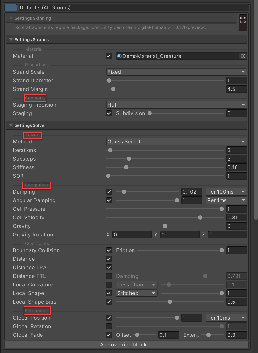 It is best practice to enable Staging. This outputs the hair simulation result to a staging buffer before rendering, which allows for tessellation prior to rendering, as well as precise motion vectors. There are two Geometry Staging options: