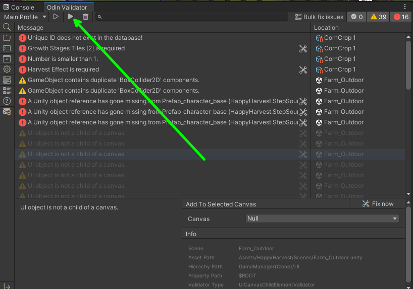 To resolve an issue, you can either fix it directly in the Odin Validator window if a fix for it is present, or you navigate to the asset in the project view or hierarchy view and fix it there. Once you’ve resolved an issue, the issue should display a green checkmark, indicating that it has been resolved.