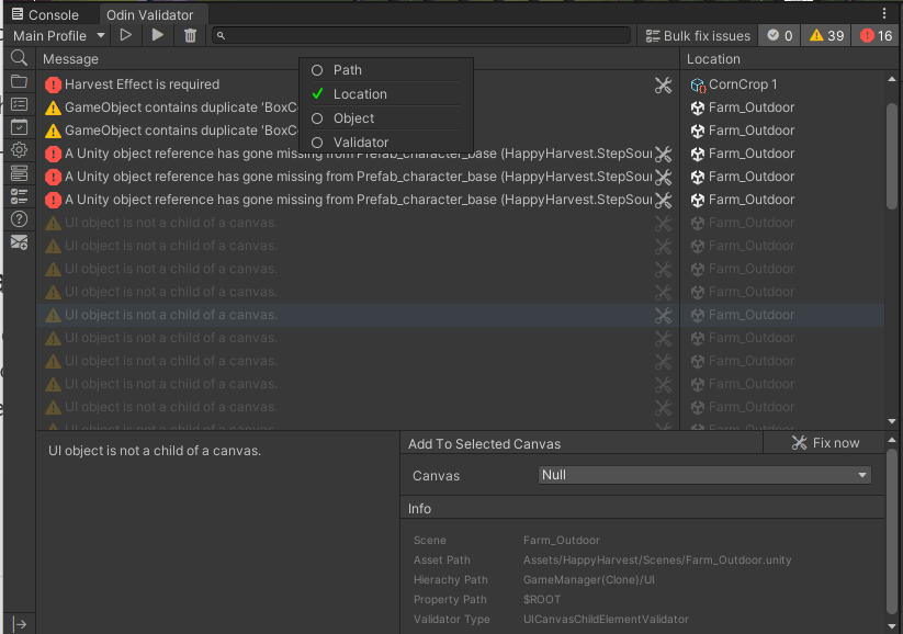 Double-clicking on an issue will highlight the asset in either the project view or the hierarchy view. If the issues appear grayed out, this means that the issues are from a scene that is not currently open. Double-clicking on a grayed-out issue will open the scene and find the game-object with the issue.