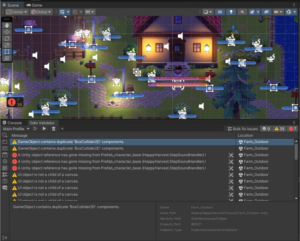 You may notice that the validator window has already found all of the issues you just added, and that the scene view widget has updated to show the number of issues found.