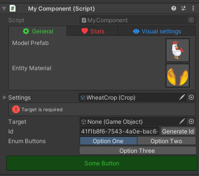 If you do not see Odin’s attributes in the Inspector window at this point, it might be because you’re working with a script that already has a custom editor made for it, in which case Odin will leave it alone. You can check if this is the case in Odin’s editor type overview by selecting Tools > Odin > Inspector > Preferences.