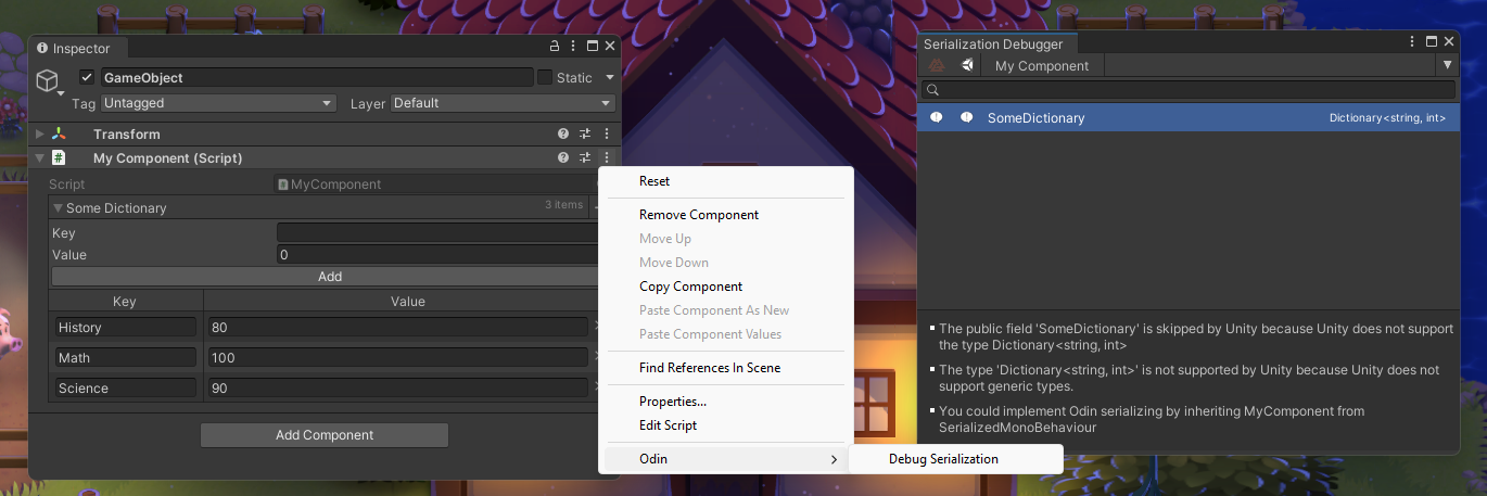 Once you have a field that is not being serialized, you can open up the serialization debugger by going to Tools > Odin Inspector > Serialization Debugger. Or you can use the context menu in the Inspector window to open it up for a script you are working with and select “Odin > Debug Serialization”. See the image below.