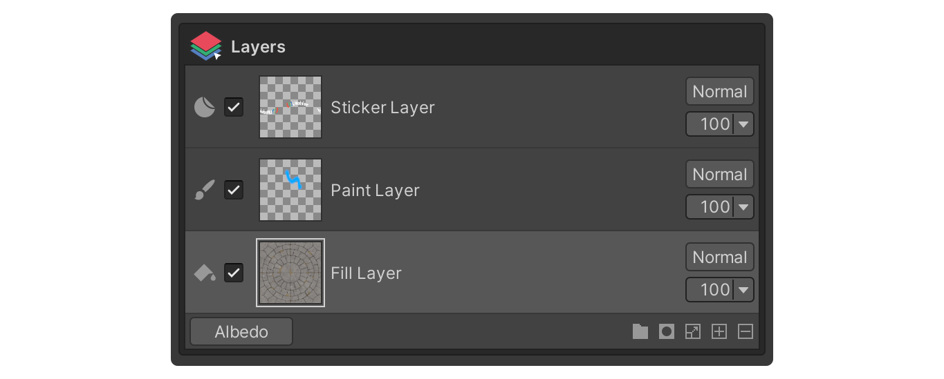 These layers are stacked from top to bottom to form a complex texture. The interaction between layers is handled by a calculation called a blending mode, which ultimately forms a unified texture.