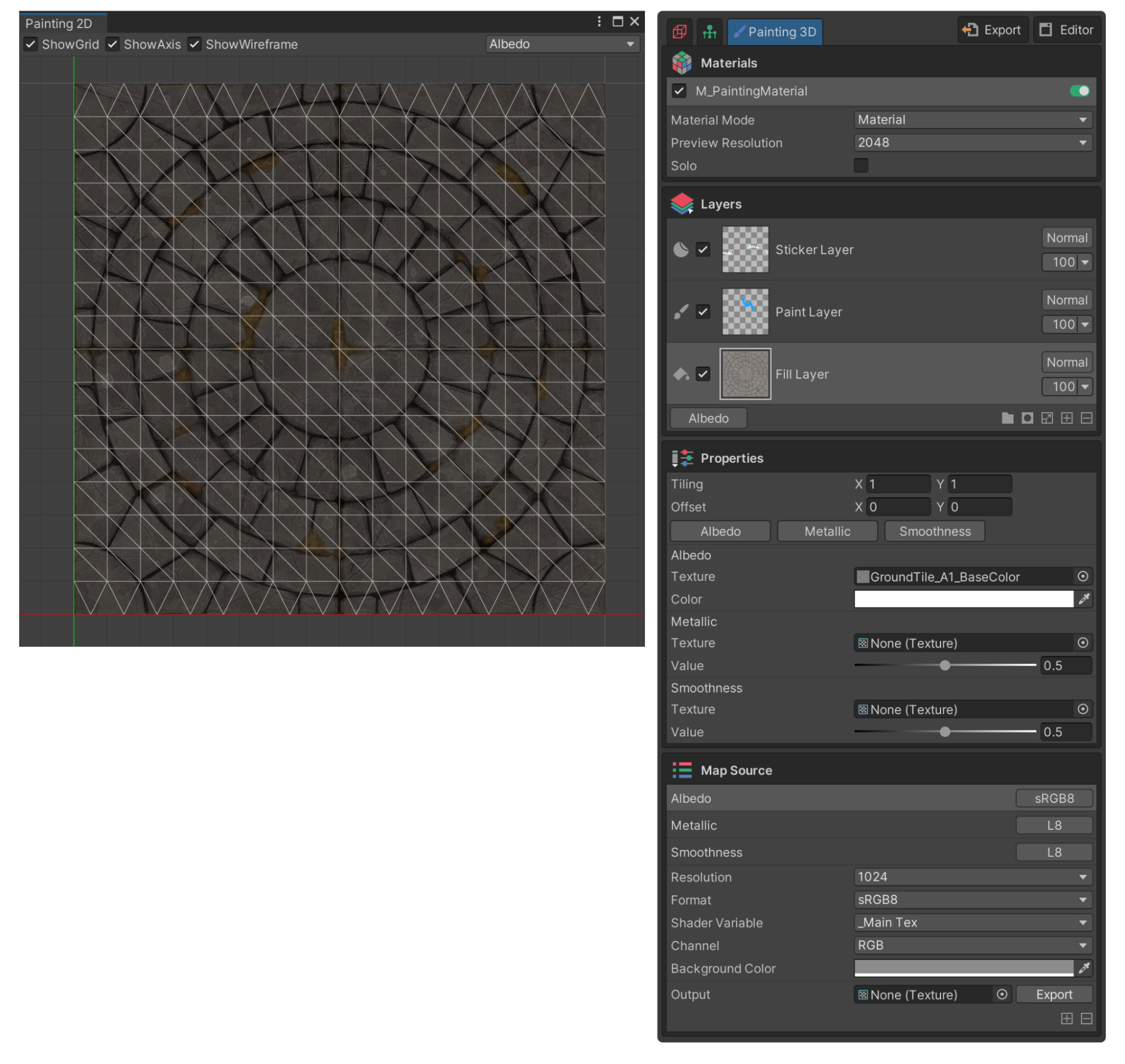A Fill Layer is a layer that applies values from a map source to the entire model in bulk. This layer is especially useful when you want to quickly change the overall color or texture of a model.