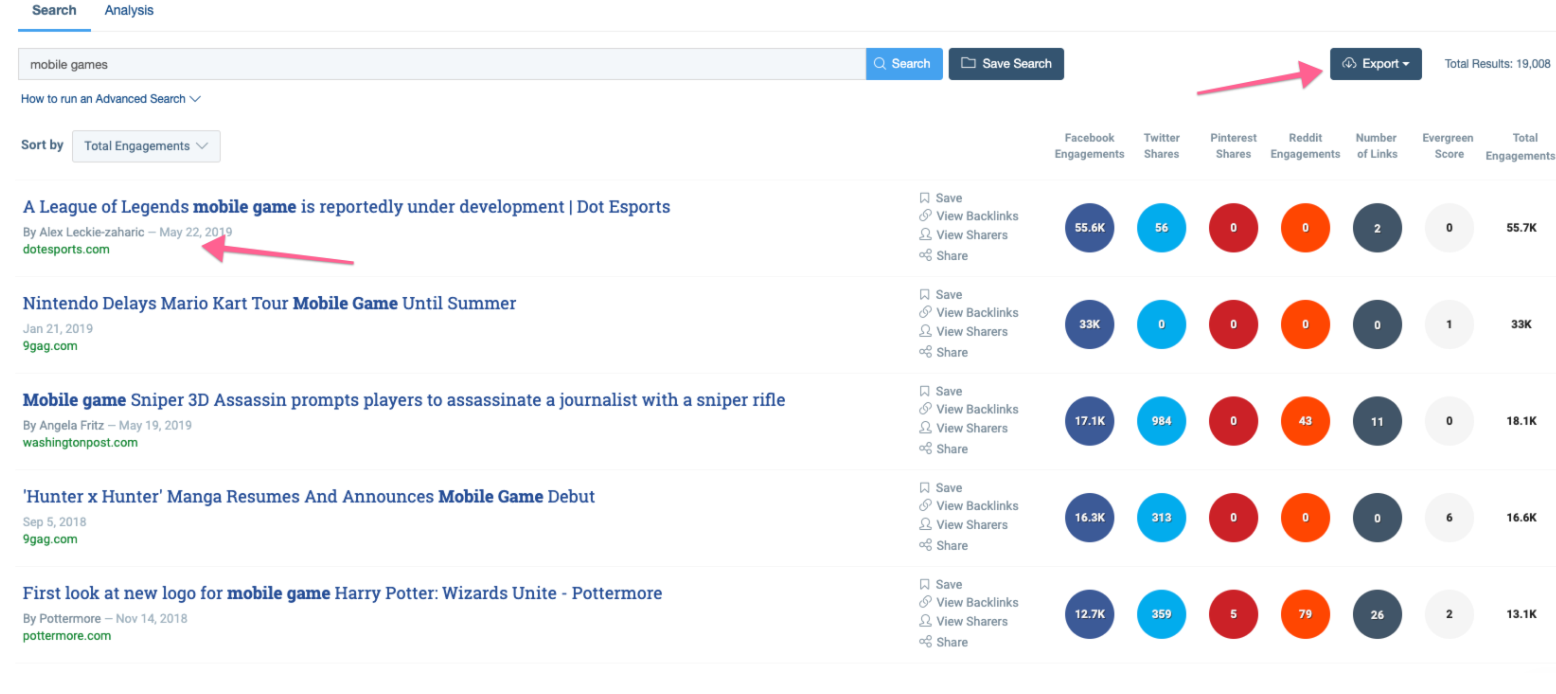 For example, if you search for “mobile games” you can filter the results to find the most popular pieces of content. Once you have this list, you will be able to identify types of websites you’ll want to target and their authors. You can also export all of this data into a CSV file, to analyze the information further.