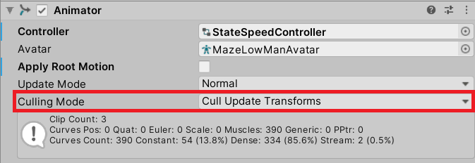 The final setting is Culling Mode. This setting affects what can cause the Animator to pause its updates for efficiency.