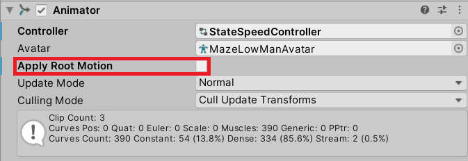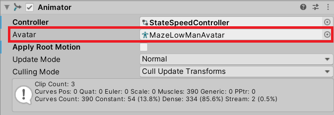When you reviewed the structure of the Animator system, you learned about the Controller property of the Animator component. Let’s now explore what the other properties do.
