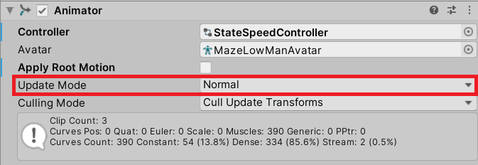 When the Update Mode is set to Normal, the update happens in time with the render system (between the Update and LateUpdate method calls). In most cases, there’s no reason to change this from Normal.