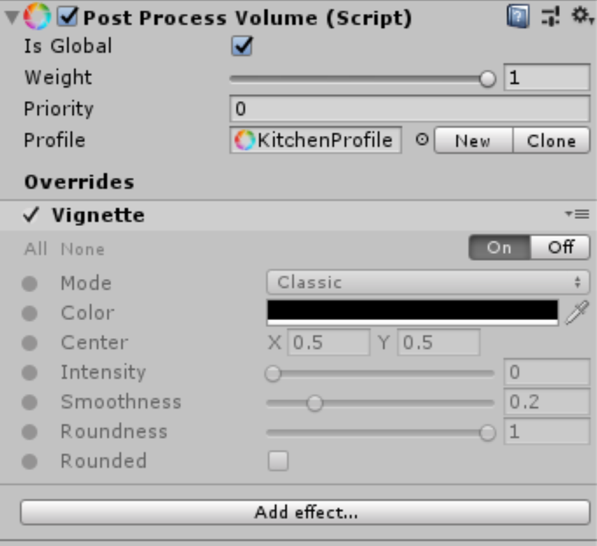 Screen-based image effects add specialized filters to the application camera which can be used to drastically increase the visual quality of a project. Unity’s Post-Processing Stack replaces previous iterations of screen-based image effects and combines them all together in an easily configurable way. Designers can easily adjust the appearance of several effects without needing to worry about technical aspects such as render order, which allows them to focus purely on the visual aesthetic of the effect. A Global Post-Processing Volume allows a designer to use the Post-Processing Stack to create an overall look and feel for their Project.