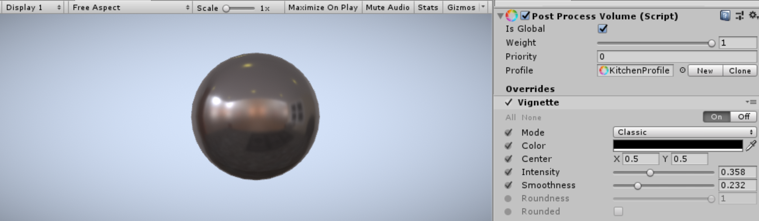 The Scene is now configured for editing the Post-Processing Profile. Any edits made to the profile will now be visible both in the game view and the scene view alike.