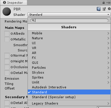 The Unity Standard Shader follows this format and is designed to work well with minimal set up. To read more about Physically Based Rendering and how the Standard Shader is used, refer to: Working with Physically-Based Shading: a Practical Approach.