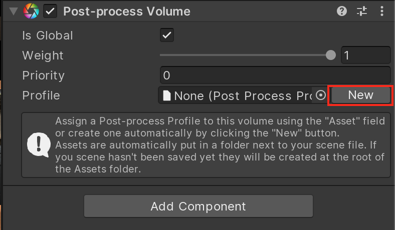 1. With the Global Post Processing Volume GameObject selected, create a new Post Processing Profile