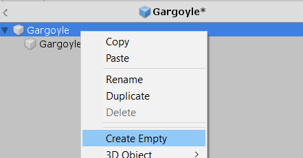 1. In the Hierarchy window, right-click on the Gargoyle GameObject and select Create Empty.