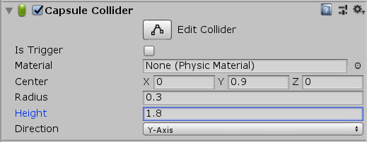 - Change the Capsule Collider’s Center property to (0, 0.9, 0)