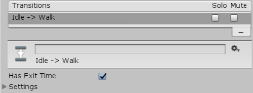 3. Select the transition from Walk to Idle in the Animator window. Disable the Has Exit Time checkbox — as before, you don’t want the state to change after a certain amount of time, just when you want it to.
