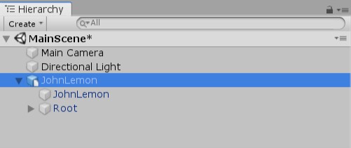 This GameObject has two children: another GameObject called JohnLemon and one called Root. Select the child GameObject called JohnLemon.