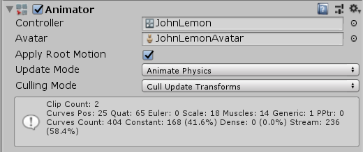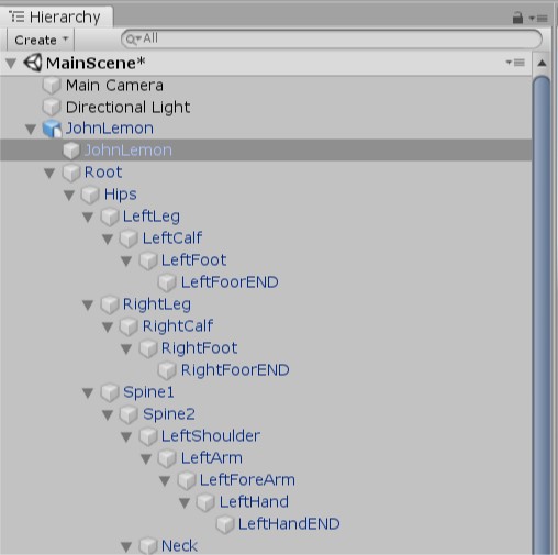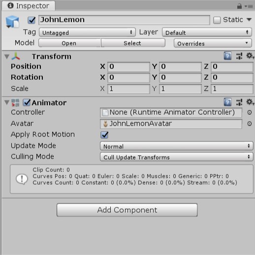 Important Note! The GameObject called Root in the JohnLemon Prefab’s hierarchy refers to the root of its skeleton, and is not the actual root GameObject. The root GameObject is whichever GameObject the Animator component is on — in this case, the GameObject called JohnLemon.