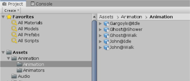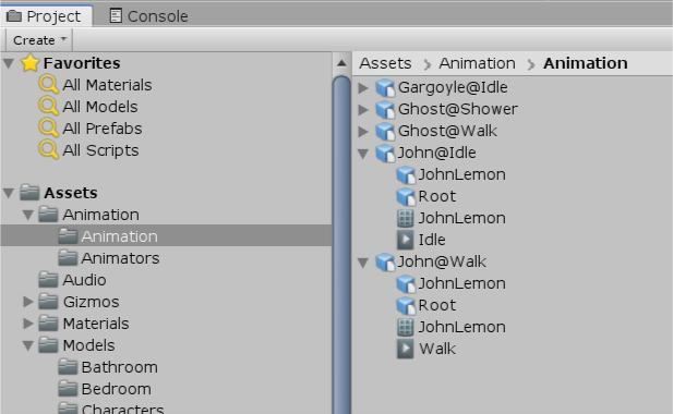 2. You should see five models, two of which start with John@. This naming convention lets you know that these are animations for JohnLemon.