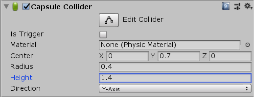 Change the Capsule Collider’s Height property to 1.4 and the Center property to (0, 0.7, 0).