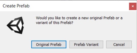 1. Drag the GameObject from the Hierarchy into the Assets > Prefabs folder in the Project window. A dialogue box will appear asking if you want to make an Original Prefab or a Prefab Variant — select Original Prefab.