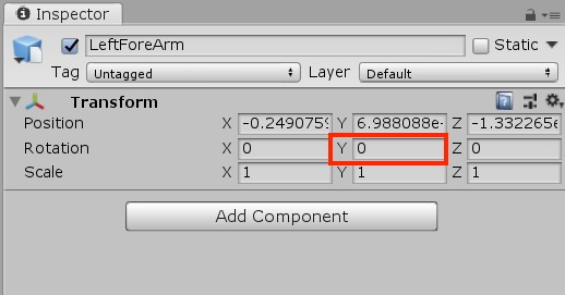 8. In the Hierarchy, select the GameObject called LeftForeArm. In its Transform component, find the Rotation field and set the Y value to 90.