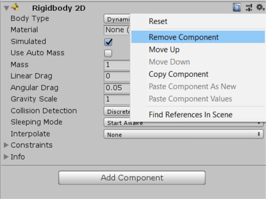 This is a 3D Project, so make sure that you click on Rigidbody and not Rigidbody 2D. If you accidentally add a component you can remove it using the component context menu — the cog in the component’s upper right corner.